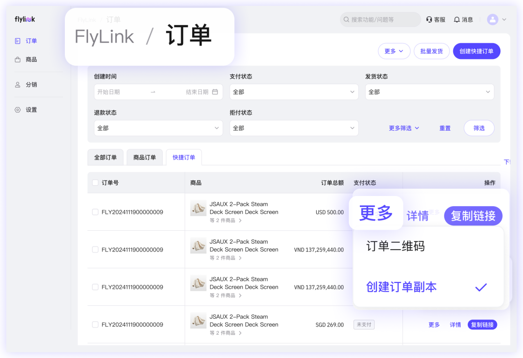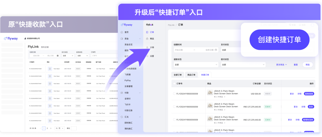 FlyLink整合原【快捷收款】功能,升级推出【快捷订单】。卖家只需创建并分享快捷订单链接,买家就可直接支付,收单更快、交易更稳!