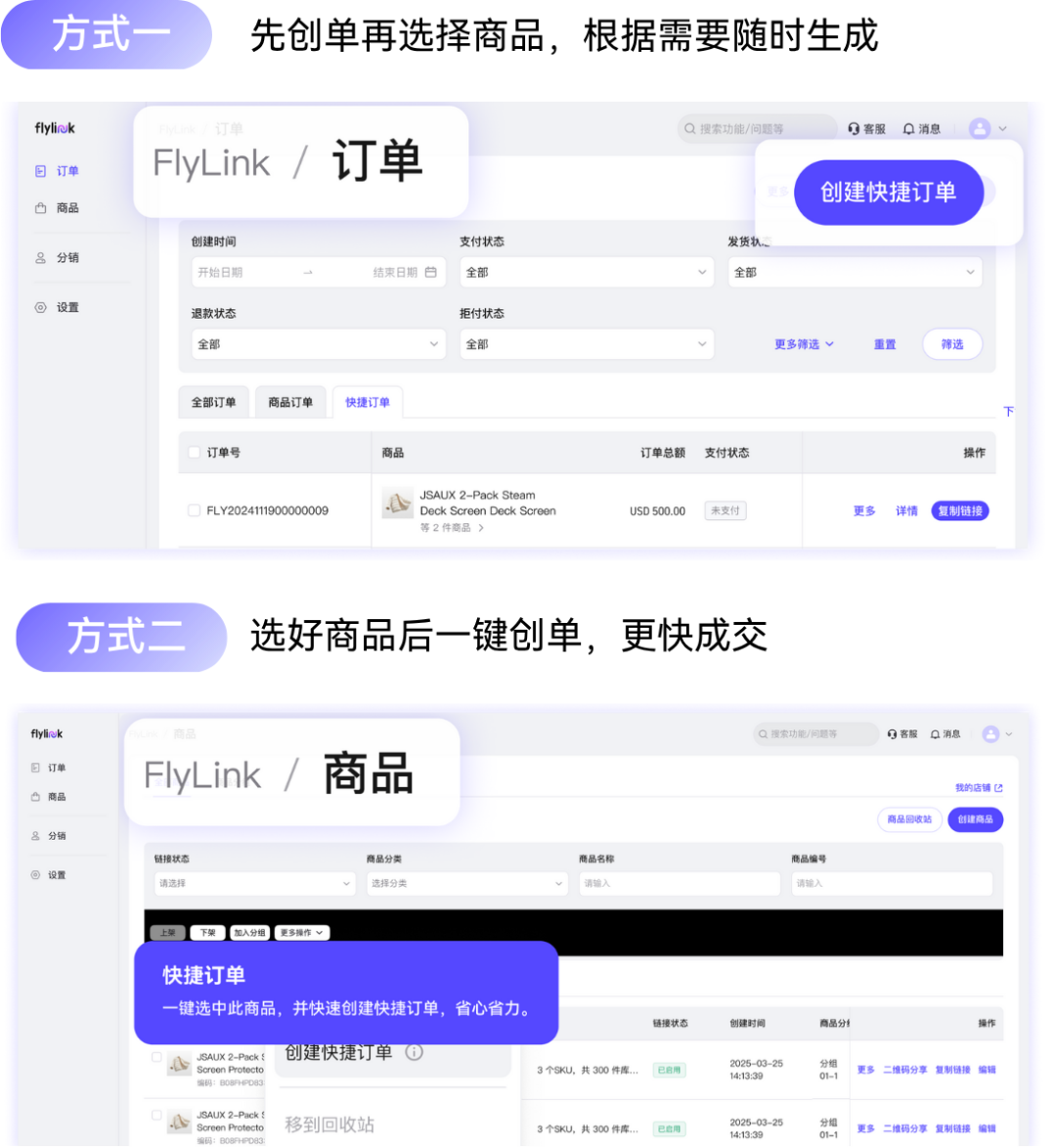 此次升级中,FlyLink升级发布【快捷订单】模式,与【商品订单】、【分销订单】并驾齐驱,精准助力卖家多场景生意转化,旺季大卖!